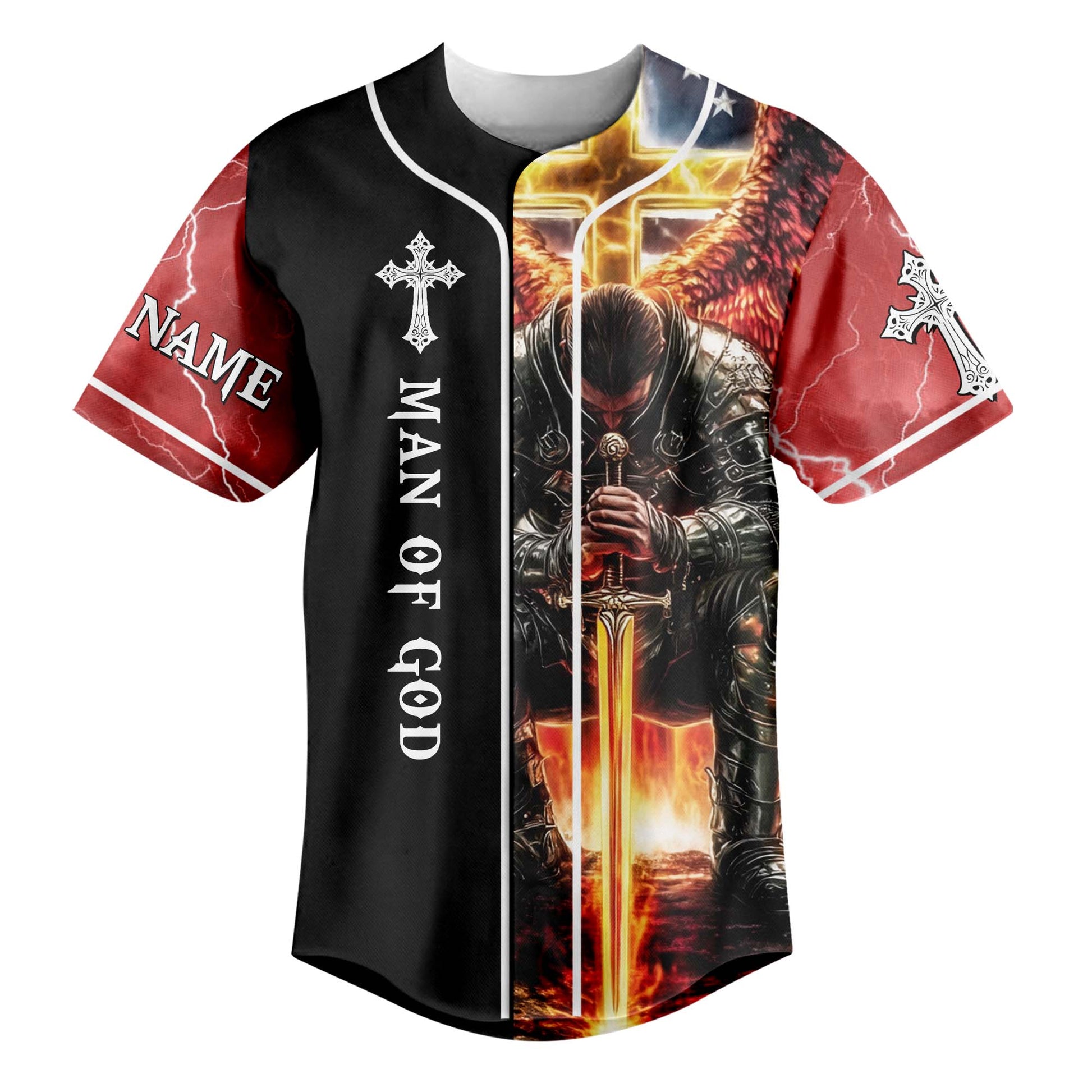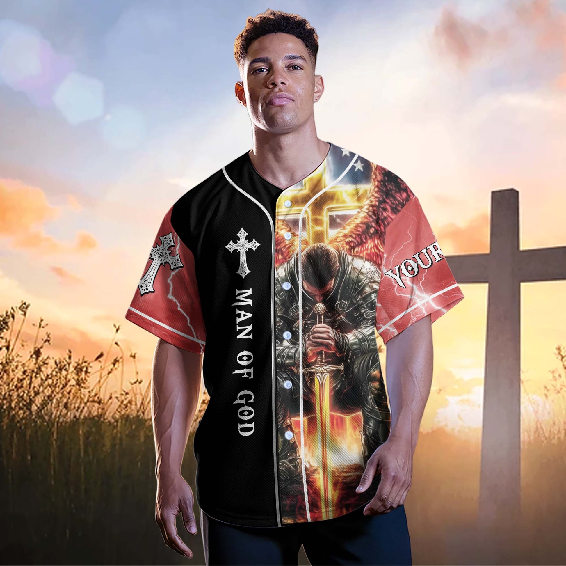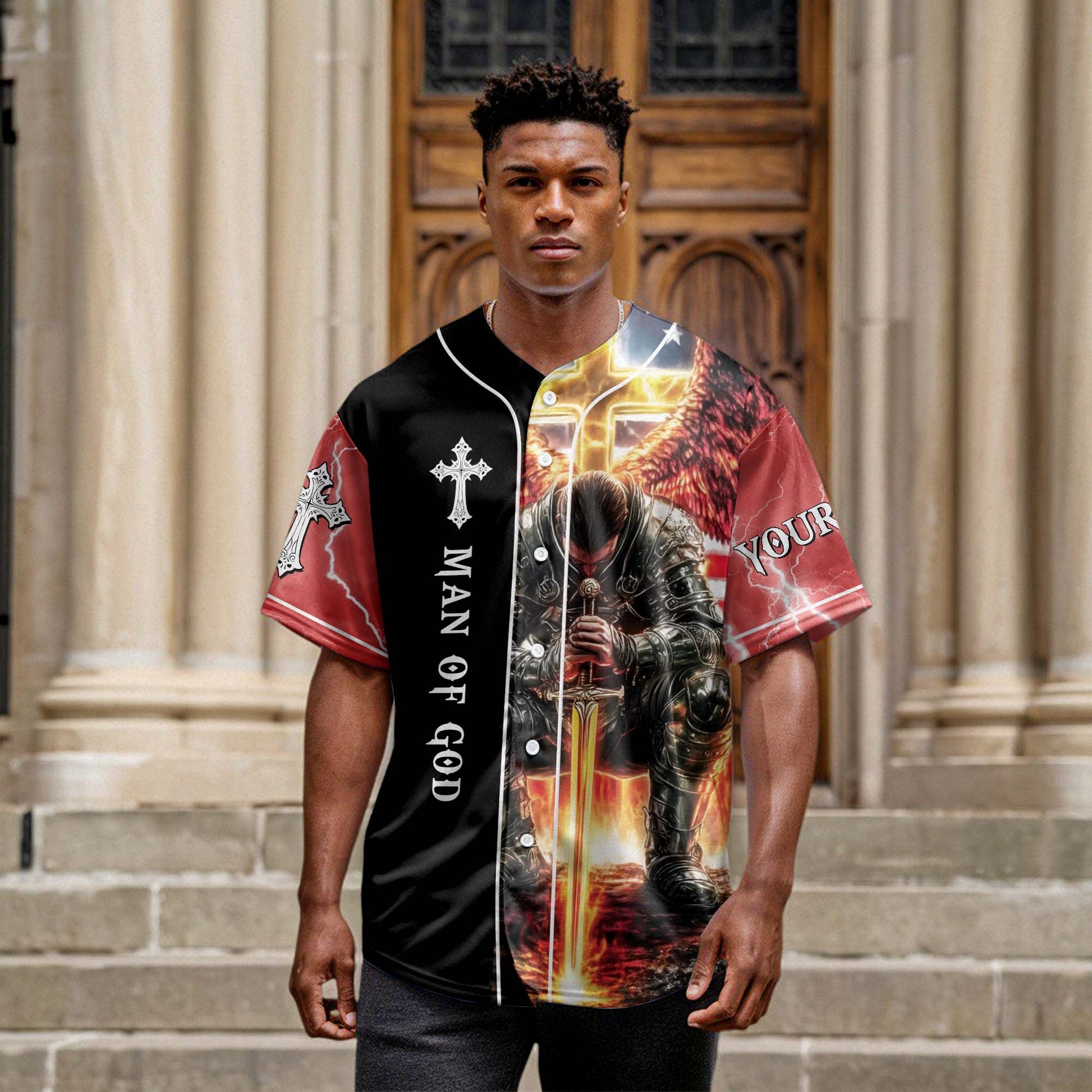 The front proudly reads “Man of God” alongside a glowing cross, with space for your personalized name on both sleeves.