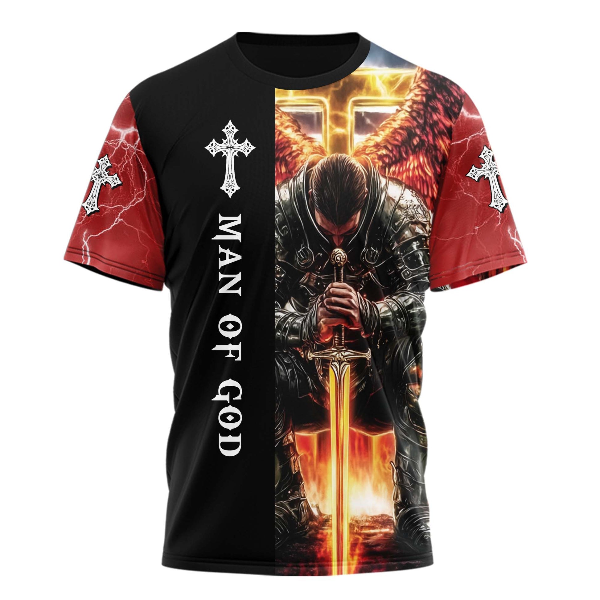 This striking tee features a powerful image of a kneeling warrior before a glowing cross, surrounded by angel wings and the American flag. On the back, the words speak loud and clear: