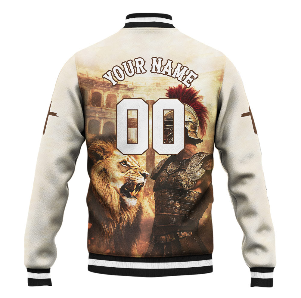 Stand strong in your faith with the "Warrior of God" Baseball Jacket — a bold declaration of spiritual strength. Featuring a fearless Roman soldier face-to-face with a roaring lion and a glowing cross in the background, this jacket captures the spirit of divine courage and unwavering belief.