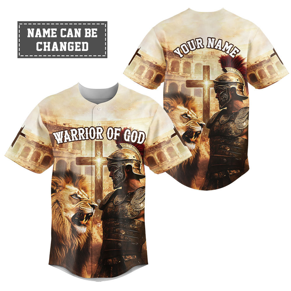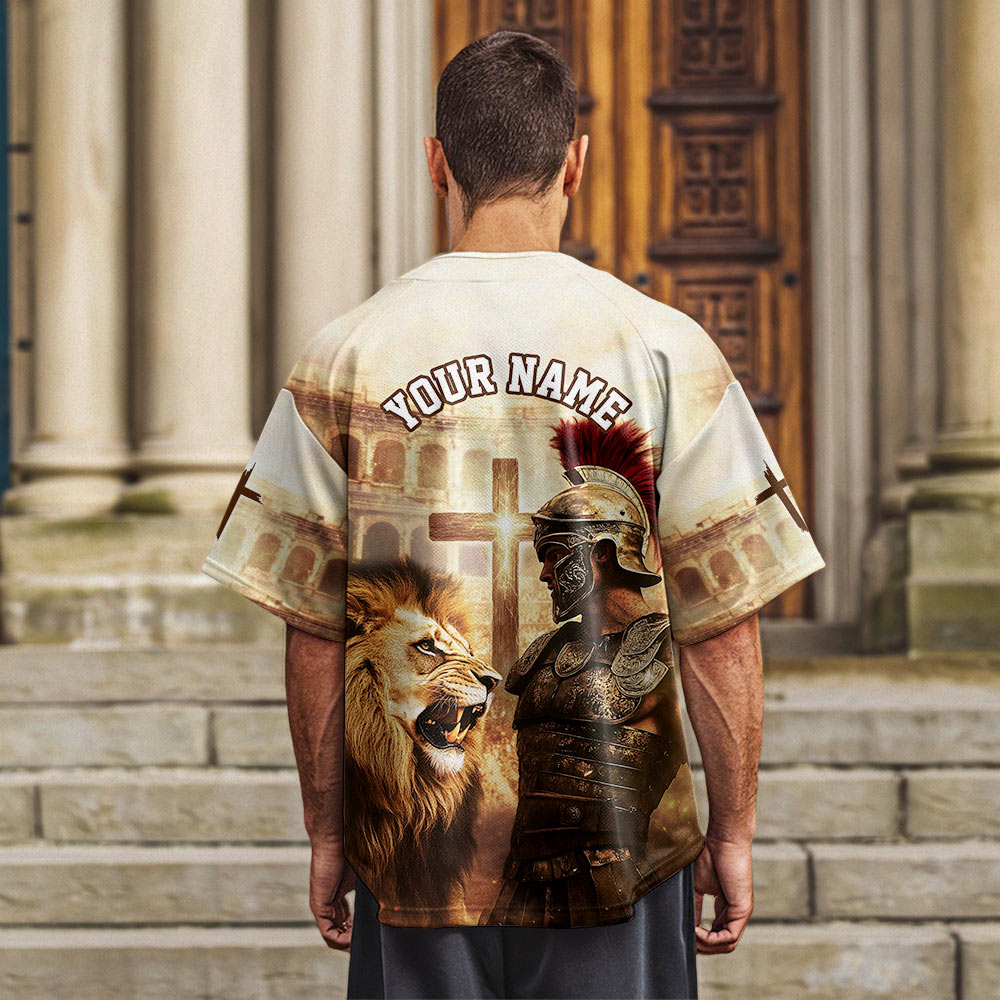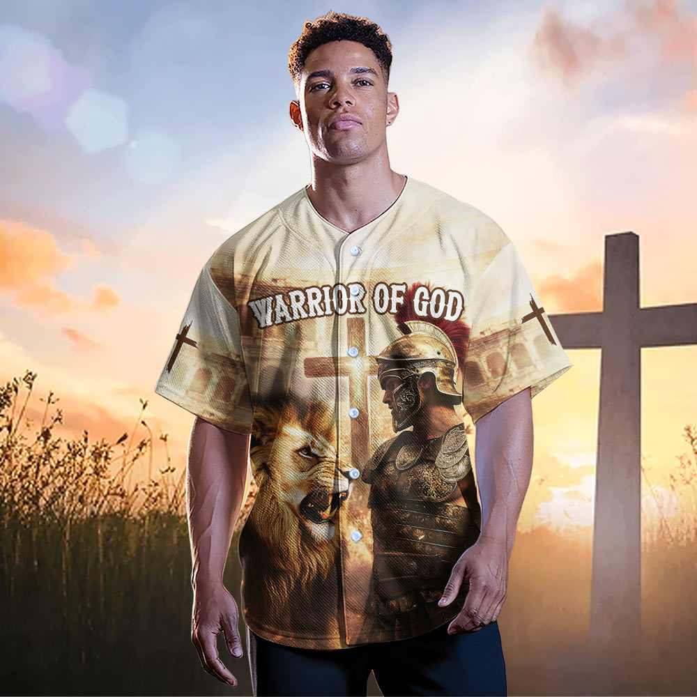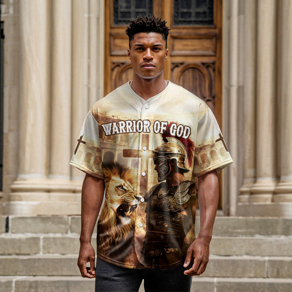 Step into battle with faith in this Warrior of God Baseball Jersey, a powerful statement of strength, courage, and devotion. Featuring a bold Roman warrior facing a fierce lion, this jersey symbolizes the spiritual warfare every believer faces, standing firm with the armor of God.