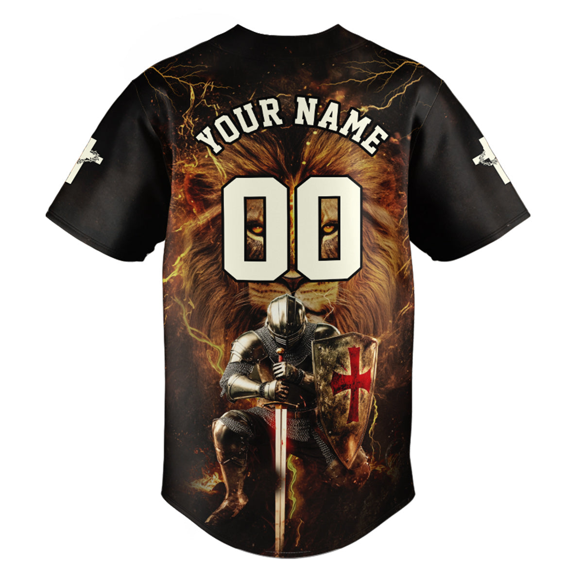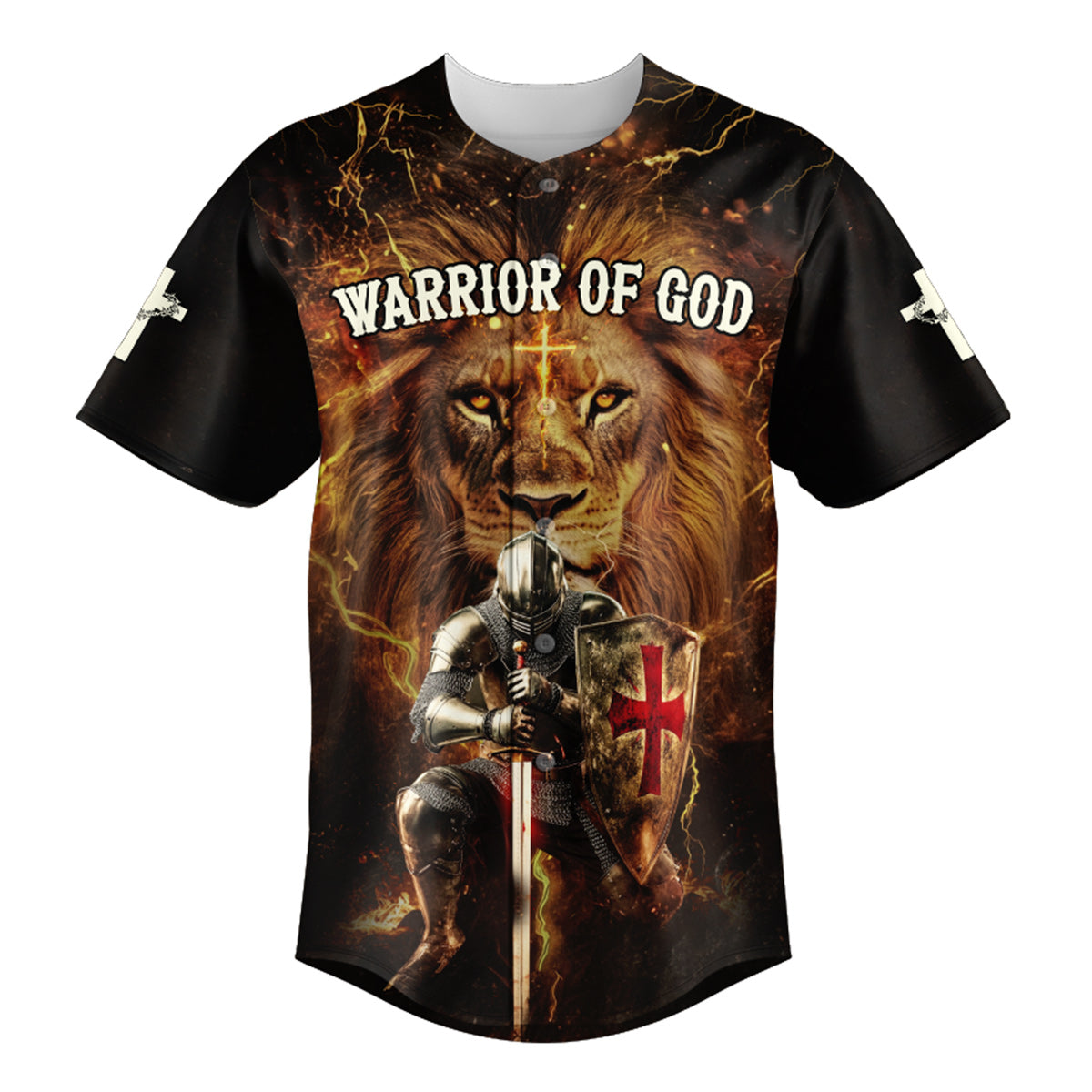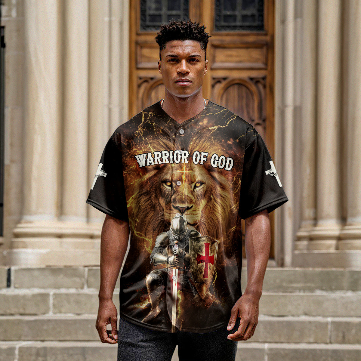 Step into your calling with the Warrior Of God Divine Crusader Baseball Jersey — a bold expression of strength, purpose, and unshakable belief. Featuring a powerful knight kneeling in full armor with a sword and shield, backed by the fierce presence of a lion marked with a radiant cross, this jersey is made for believers who live every day on the spiritual battlefield.