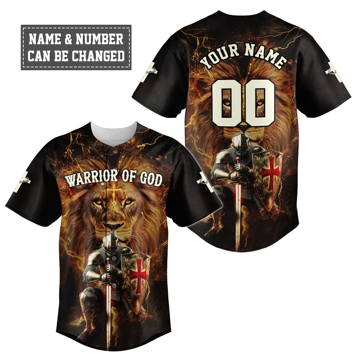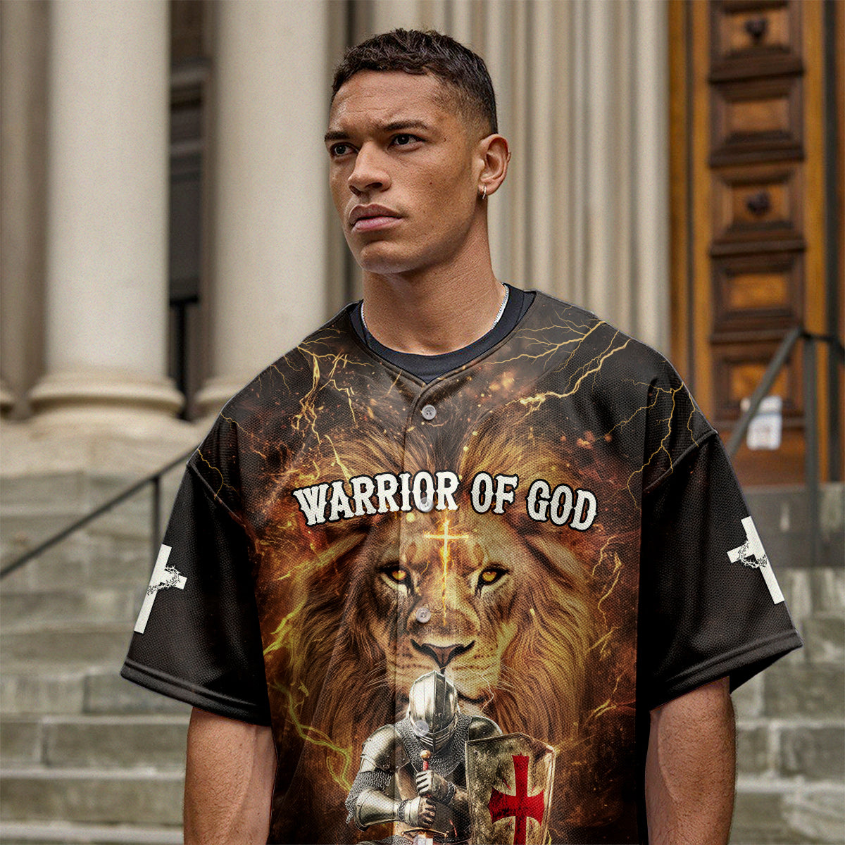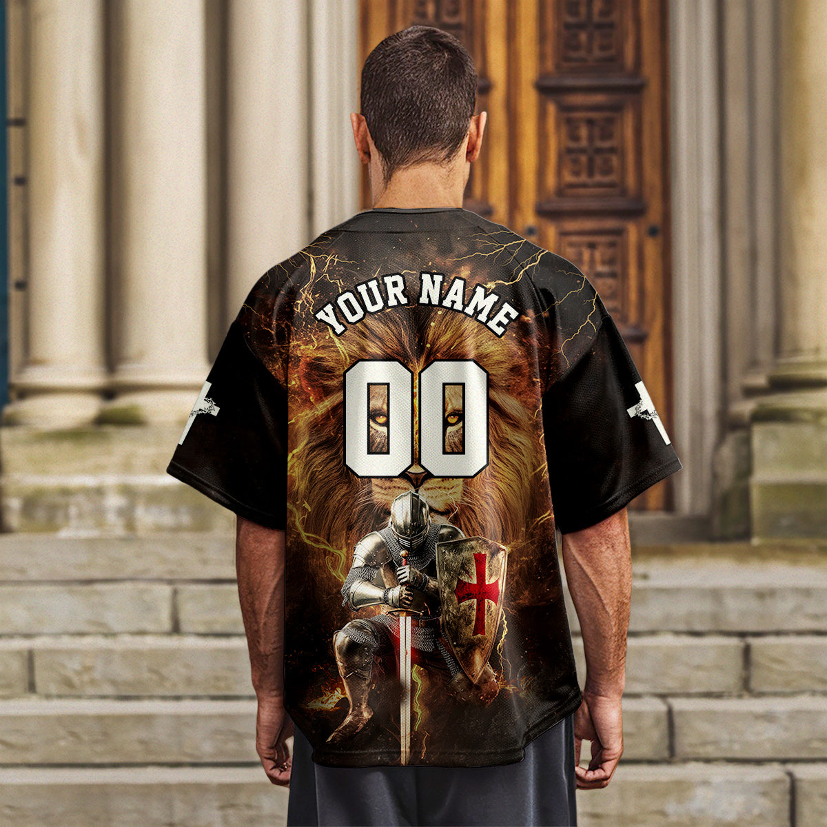 Step into your calling with the Warrior Of God Divine Crusader Baseball Jersey — a bold expression of strength, purpose, and unshakable belief. Featuring a powerful knight kneeling in full armor with a sword and shield, backed by the fierce presence of a lion marked with a radiant cross, this jersey is made for believers who live every day on the spiritual battlefield.