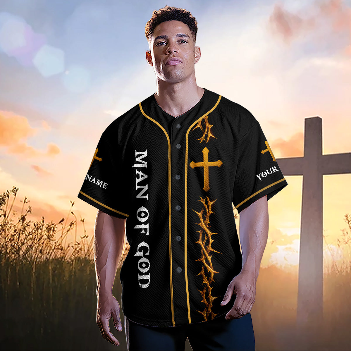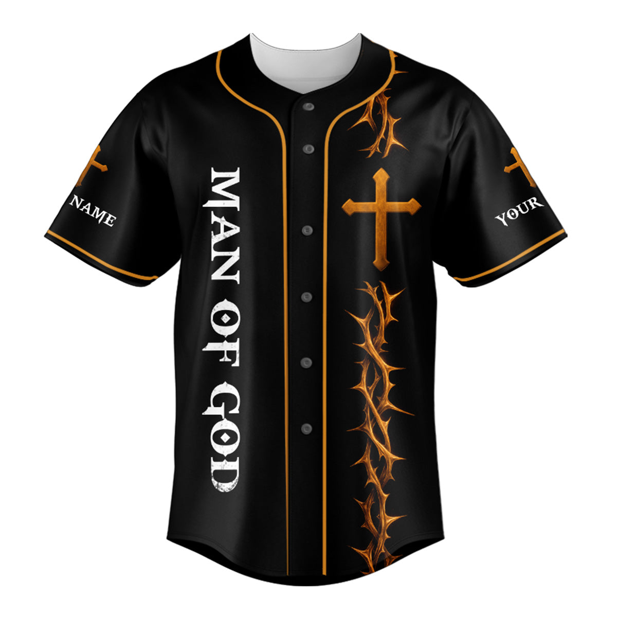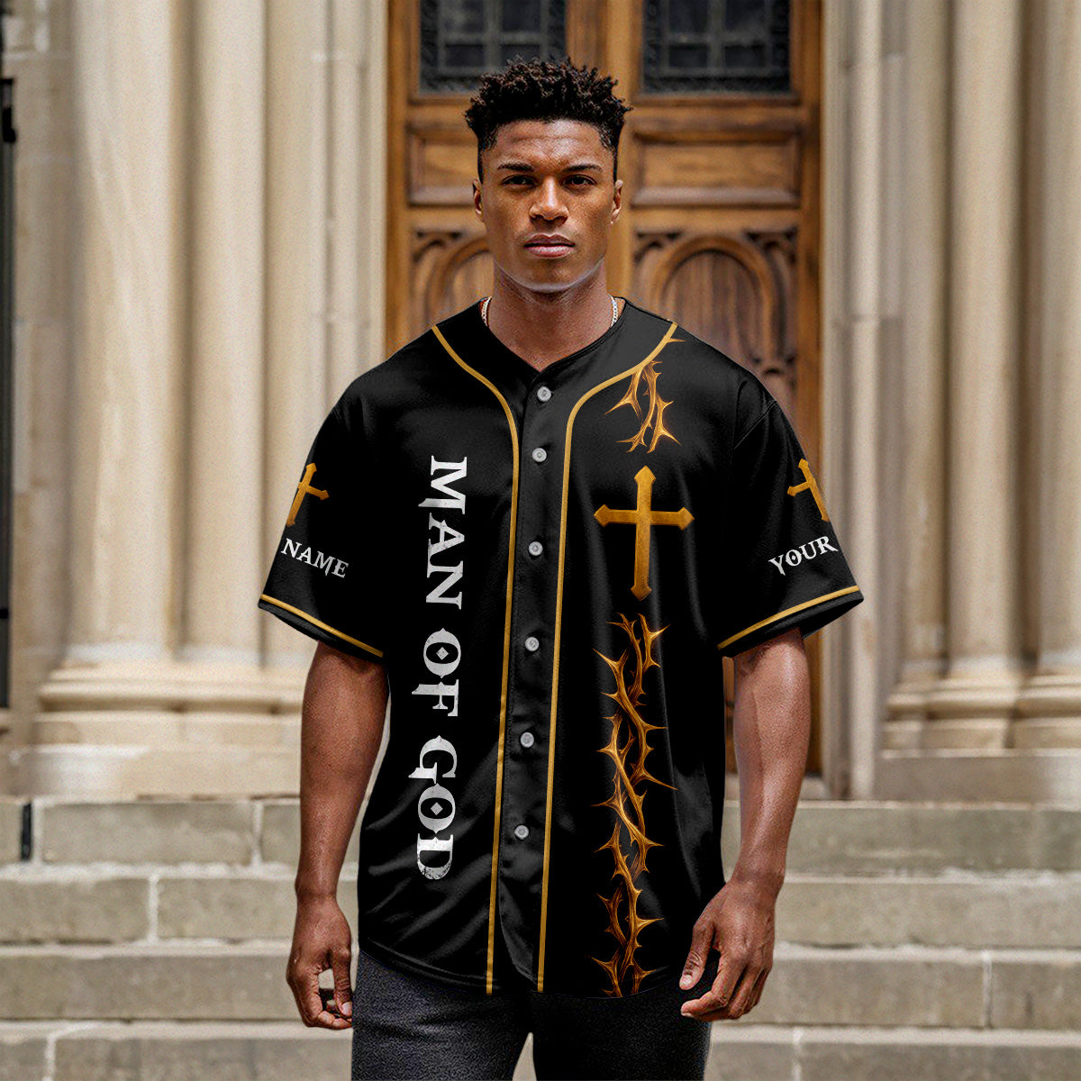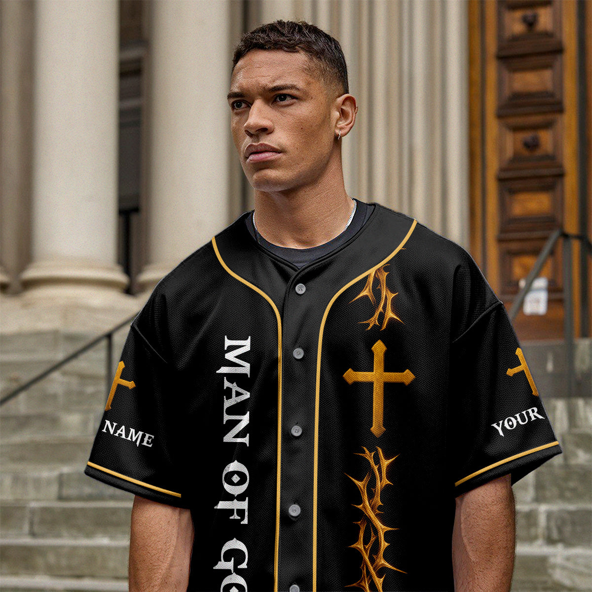 The front includes “Man of God”, a glowing cross, and custom name options for a personal touch.