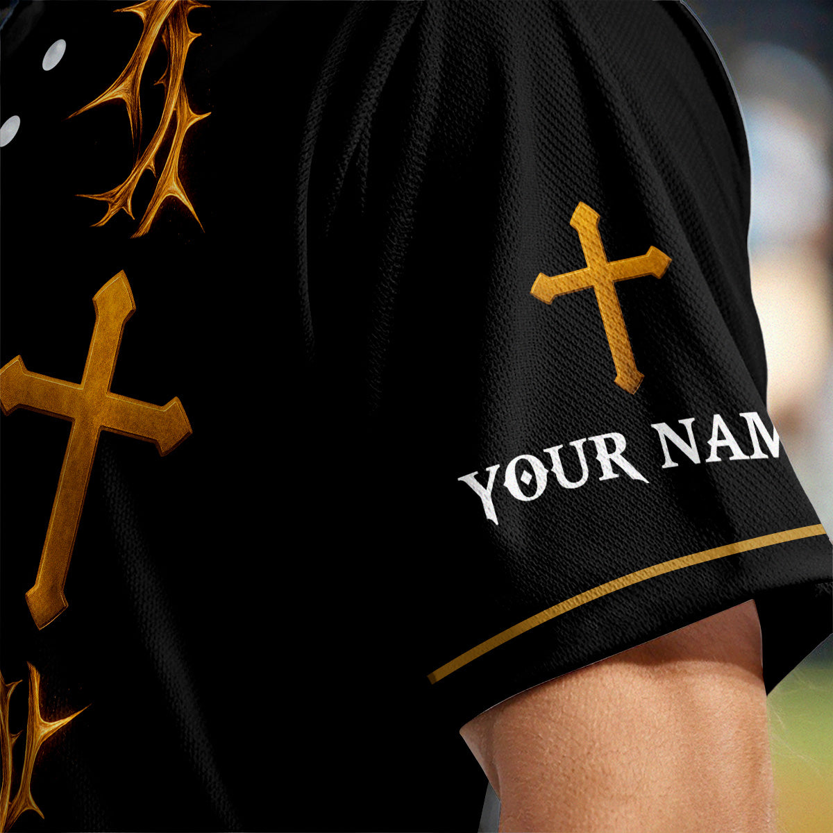 This powerful jersey features a majestic lion illuminated by a glowing cross, symbolizing strength, presence, and divine truth. The back proudly displays the beloved worship lyrics: