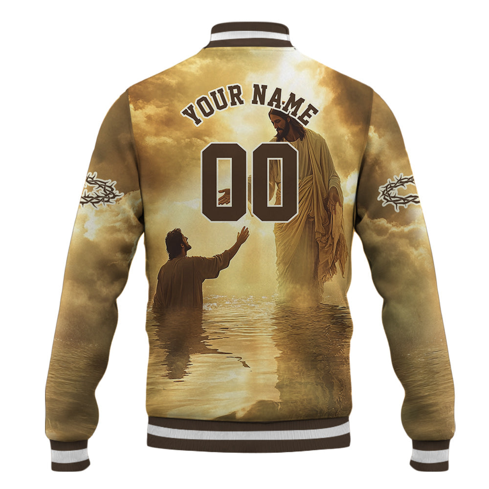 Let your faith shine with the When Life Knocks Me Down Jesus Picks Me Up Baseball Jacket, a powerful reminder that no matter how hard life gets, Jesus is always there to lift us up. Featuring a beautiful golden design of Christ reaching out His hand to lift a struggling man from the water, this jacket symbolizes grace, redemption, and unwavering trust in Him. The "When Life Knocks Me Down, Jesus Picks Me Up" message reinforces the strength of faith during tough times.