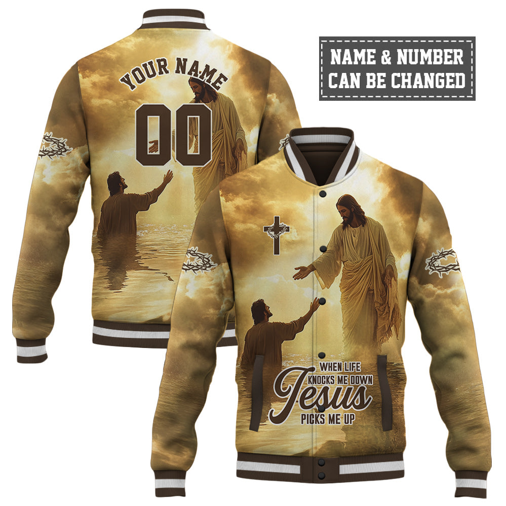 When Life Knocks Me Down Jesus Picks Me Up Baseball Jacket - Custom Name & Number