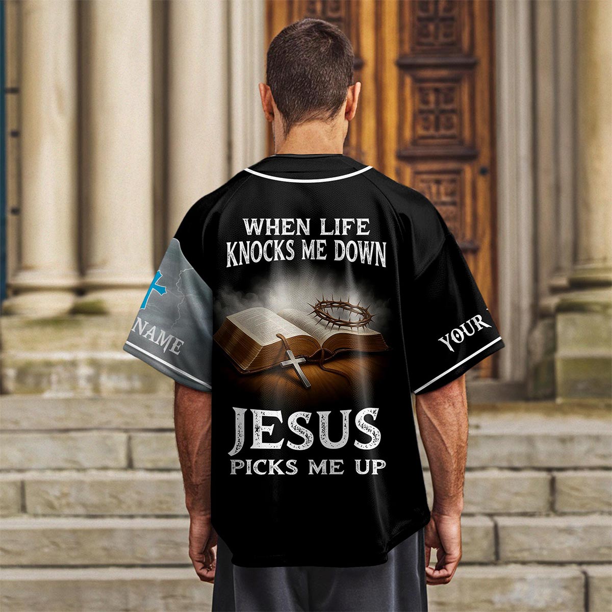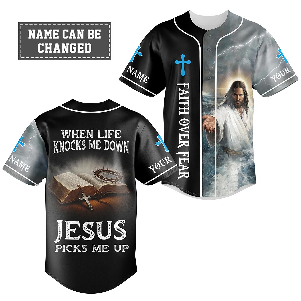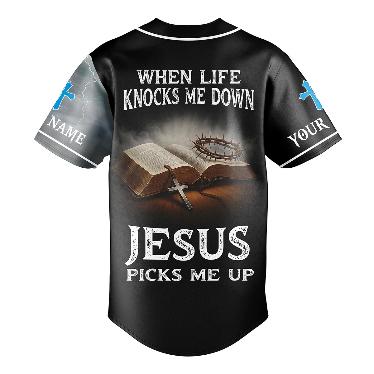 Stay grounded in your faith with the When Life Knocks Me Down Jesus Picks Me Up Baseball Jersey — a powerful reminder that no matter the storm, Jesus is always there to lift you up. Featuring a stunning design of Jesus reaching through the waves with light shining through the storm, paired with an open Bible, crown of thorns, and cross on the back, this jersey radiates strength, hope, and salvation.