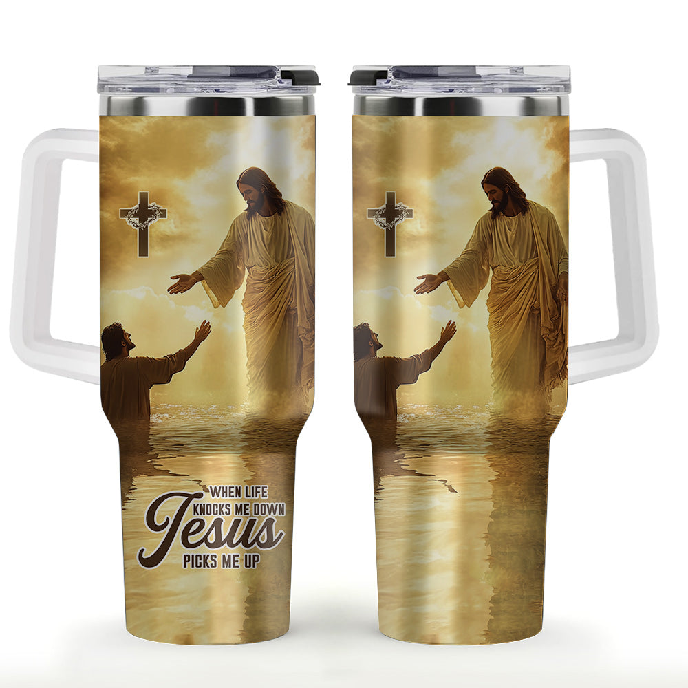 Stay inspired with the When Life Knocks Me Down, Jesus Picks Me Up Tumbler, featuring a powerful image of Jesus extending His hand to lift someone from the water, symbolizing hope, faith, and divine guidance. The warm golden tones radiate peace, while the uplifting quote reminds us of His unwavering love and support.