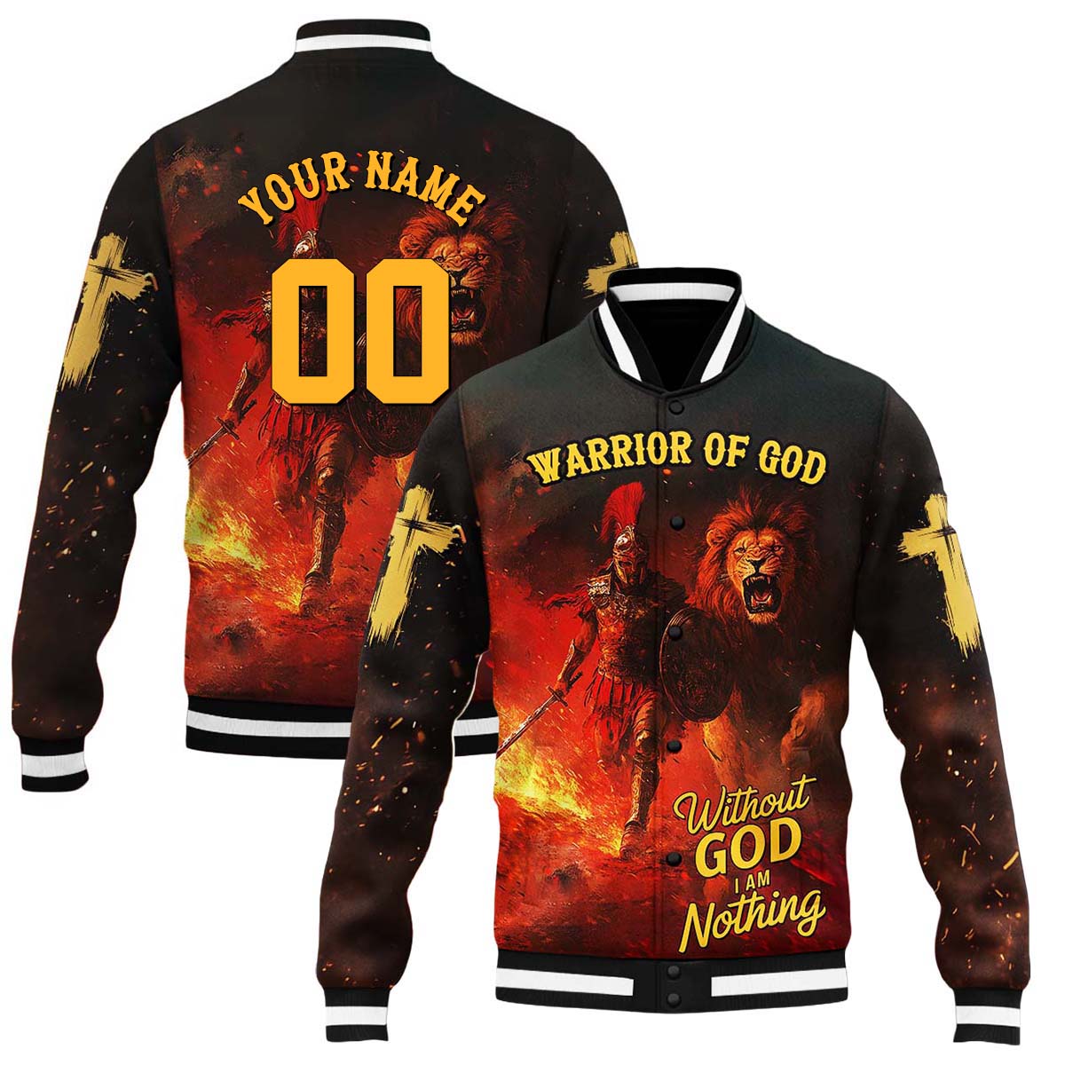 Let your faith lead with the Without God I Am Nothing Baseball Jacket, a bold and fiery design that captures the power of total surrender to God. Featuring a fearless warrior walking through flames beside a roaring lion, this jacket represents strength, courage, and the truth that our power comes only from Him.